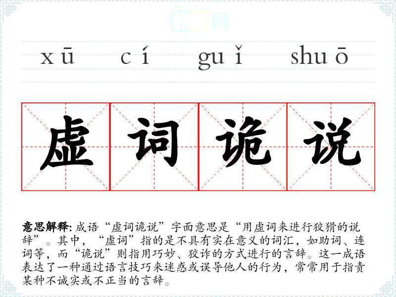成语“虚词诡说”字面意思是“用虚词来进行狡猾的说辞”。其中,“虚词”指的是不具有实在意义的词汇,如助词、连词等,而“诡说”则指用巧妙、狡诈的方式进行的言辞。这一成语表达了一种通过语言技巧来迷惑或误导他人的行为,常常用于指责某种不诚实或不正当的言辞。