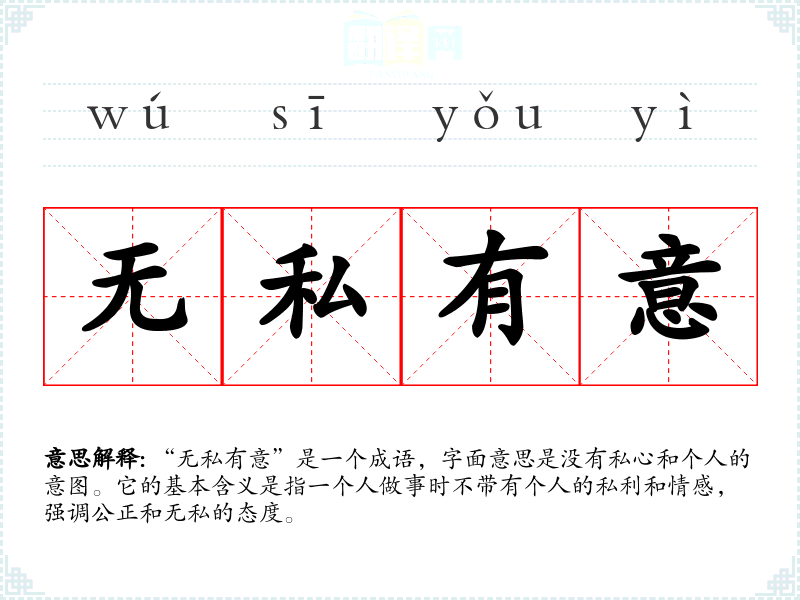 “无私有意”是一个成语,字面意思是没有私心和个人的意图。它的基本含义是指一个人做事时不带有个人的私利和情感,强调公正和无私的态度。