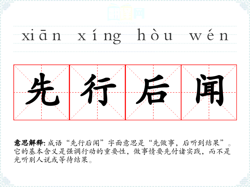 成语“先行后闻”字面意思是“先做事,后听到结果”。它的基本含义是强调行动的重要性,做事情要先付诸实践,而不是光听别人说或等待结果。