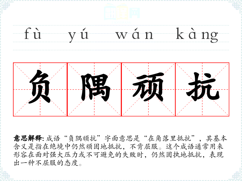 成语“负隅顽抗”字面意思是“在角落里抵抗”,其基本含义是指在绝境中仍然顽固地抵抗,不肯屈服。这个成语通常用来形容在面对强大压力或不可避免的失败时,仍然固执地抵抗,表现出一种不屈服的态度。