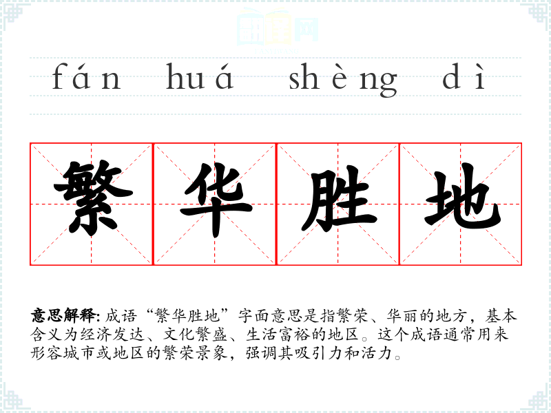 成语“繁华胜地”字面意思是指繁荣、华丽的地方,基本含义为经济发达、文化繁盛、生活富裕的地区。这个成语通常用来形容城市或地区的繁荣景象,强调其吸引力和活力。