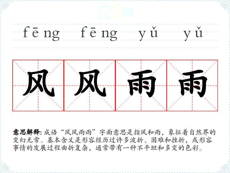 成语“风风雨雨”字面意思是指风和雨,象征着自然界的变幻无常。基本含义是形容经历过许多波折、困难和挫折,或形容事情的发展过程曲折复杂,通常带有一种不平坦和多变的色彩。