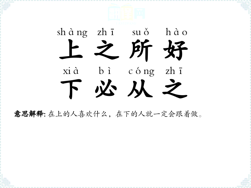 上:居上位的人;好:爱好;甚:更厉害。居上位的人有哪一种爱好,在下面的人必定爱好得更厉害。指上行下效,影响深重。 |