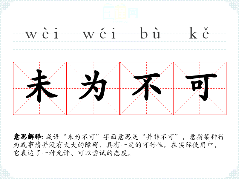 成语“未为不可”字面意思是“并非不可”,意指某种行为或事情并没有太大的障碍,具有一定的可行性。在实际使用中,它表达了一种允许、可以尝试的态度。