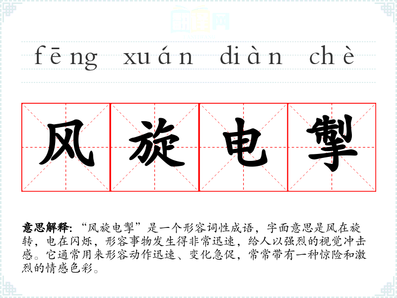 “风旋电掣”是一个形容词性成语,字面意思是风在旋转,电在闪烁,形容事物发生得非常迅速,给人以强烈的视觉冲击感。它通常用来形容动作迅速、变化急促,常常带有一种惊险和激烈的情感色彩。