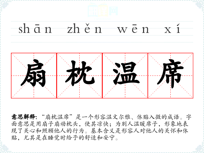 “扇枕温席”是一个形容温文尔雅、体贴入微的成语。字面意思是用扇子扇动枕头,使其凉快;为别人温暖席子,形象地表现了关心和照顾他人的行为。基本含义是形容人对他人的关怀和体贴,尤其是在睡觉时给予的舒适和安宁。