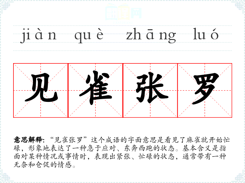 “见雀张罗”这个成语的字面意思是看见了麻雀就开始忙碌,形象地表达了一种急于应对、东奔西跑的状态。基本含义是指面对某种情况或事情时,表现出紧张、忙碌的状态,通常带有一种无奈和仓促的情感。