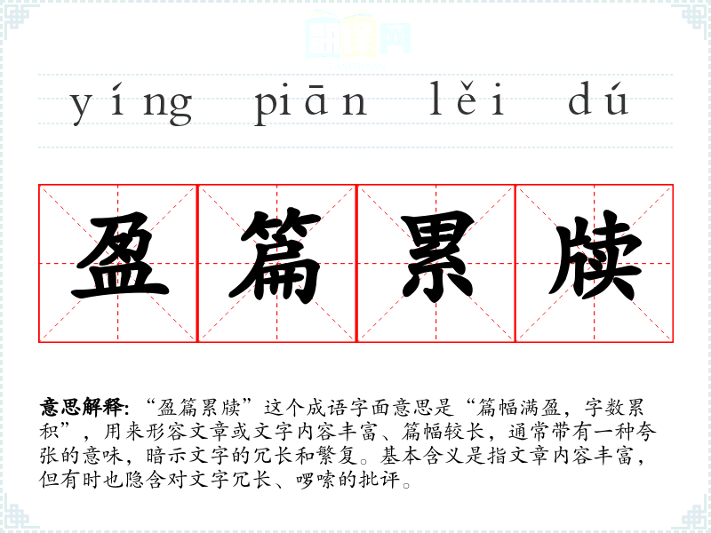 “盈篇累牍”这个成语字面意思是“篇幅满盈,字数累积”,用来形容文章或文字内容丰富、篇幅较长,通常带有一种夸张的意味,暗示文字的冗长和繁复。基本含义是指文章内容丰富,但有时也隐含对文字冗长、啰嗦的批评。