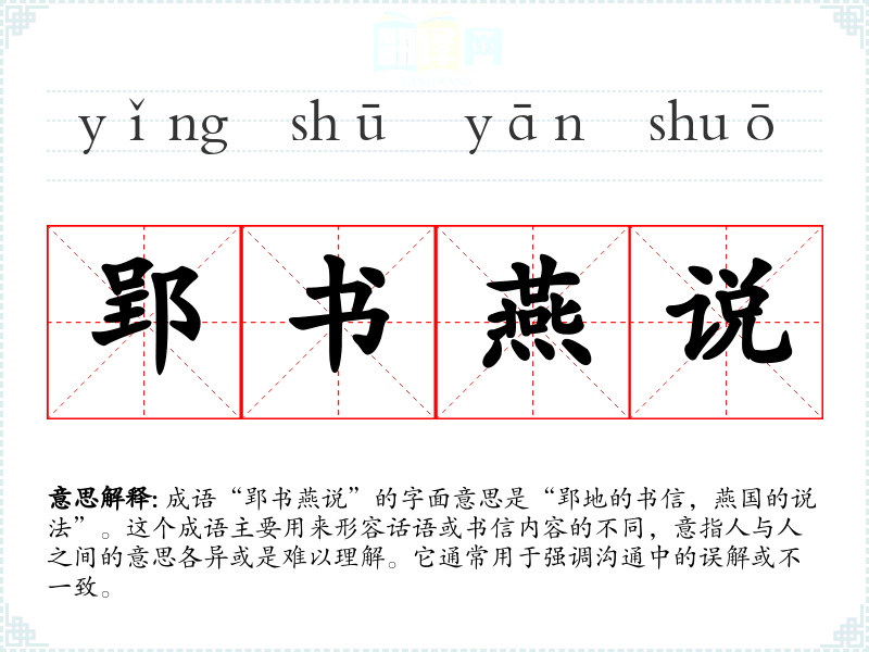 成语“郢书燕说”的字面意思是“郢地的书信,燕国的说法”。这个成语主要用来形容话语或书信内容的不同,意指人与人之间的意思各异或是难以理解。它通常用于强调沟通中的误解或不一致。