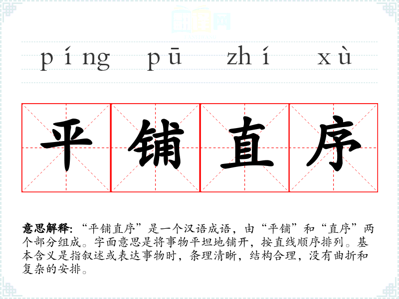 “平铺直序”最早出现在清代文学作品中,尤其在文学评论和学术文章中常被提及。成语的形成与古代文人对文章结构的讲究密切相关,强调写作要有条理、清晰,避免冗杂和含糊。