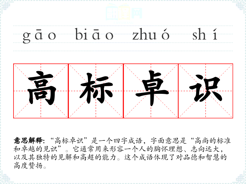 “高标卓识”是一个四字成语,字面意思是“高尚的标准和卓越的见识”。它通常用来形容一个人的胸怀理想、志向远大,以及其独特的见解和高超的能力。这个成语体现了对品德和智慧的高度赞扬。