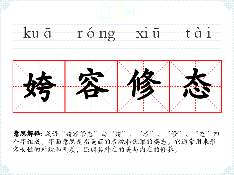 成语“姱容修态”由“姱”、“容”、“修”、“态”四个字组成。字面意思是指美丽的容貌和优雅的姿态。它通常用来形容女性的外貌和气质,强调其外在的美与内在的修养。