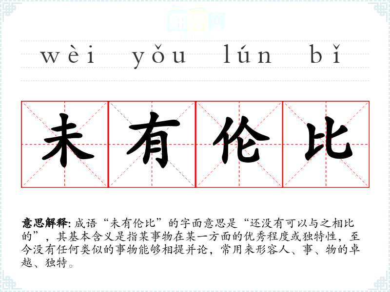 成语“未有伦比”的字面意思是“还没有可以与之相比的”,其基本含义是指某事物在某一方面的优秀程度或独特性,至今没有任何类似的事物能够相提并论,常用来形容人、事、物的卓越、独特。