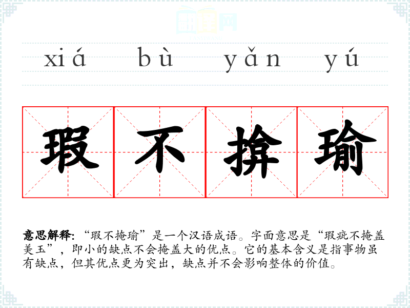 | 瑕不掩瑜 | 瑕:玉上面的斑点,比喻缺点;掩:遮盖;瑜:美玉的光泽,比喻优点。比喻缺点掩盖不了优点,缺点是次要的,优点是主要的。 |