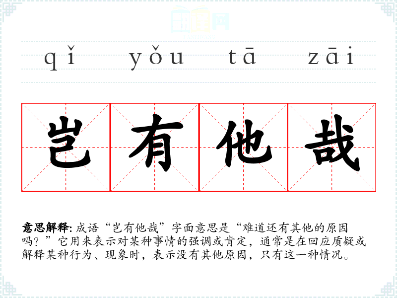 成语“岂有他哉”字面意思是“难道还有其他的原因吗?”它用来表示对某种事情的强调或肯定,通常是在回应质疑或解释某种行为、现象时,表示没有其他原因,只有这一种情况。