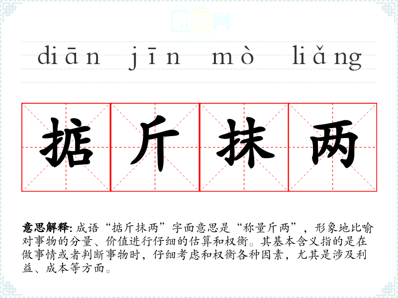 成语“掂斤抹两”字面意思是“称量斤两”,形象地比喻对事物的分量、价值进行仔细的估算和权衡。其基本含义指的是在做事情或者判断事物时,仔细考虑和权衡各种因素,尤其是涉及利益、成本等方面。