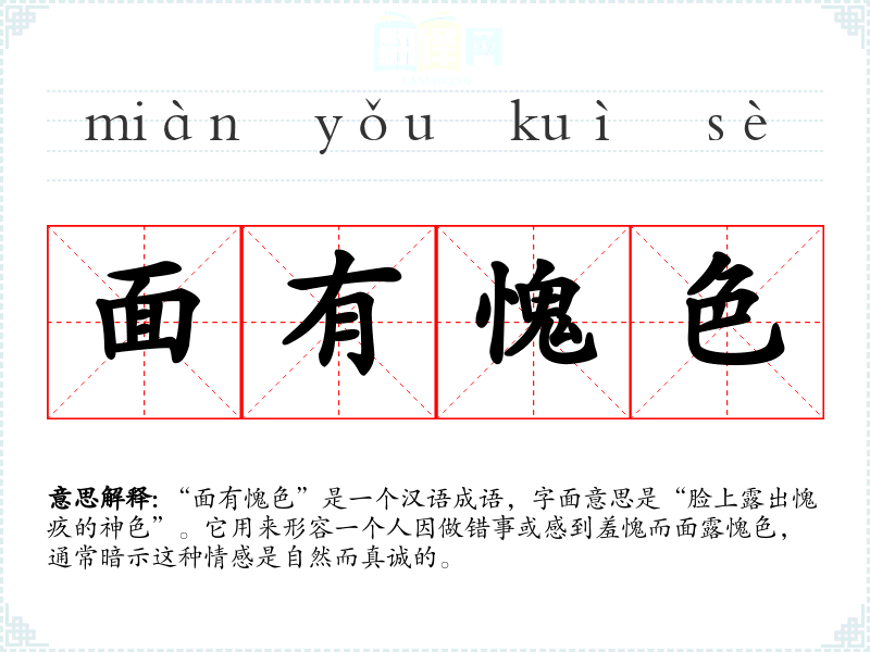 “面有愧色”是一个汉语成语,字面意思是“脸上露出愧疚的神色”。它用来形容一个人因做错事或感到羞愧而面露愧色,通常暗示这种情感是自然而真诚的。