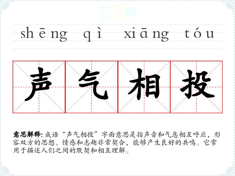 成语“声气相投”字面意思是指声音和气息相互呼应,形容双方的思想、情感和志趣非常契合,能够产生良好的共鸣。它常用于描述人们之间的默契和相互理解。