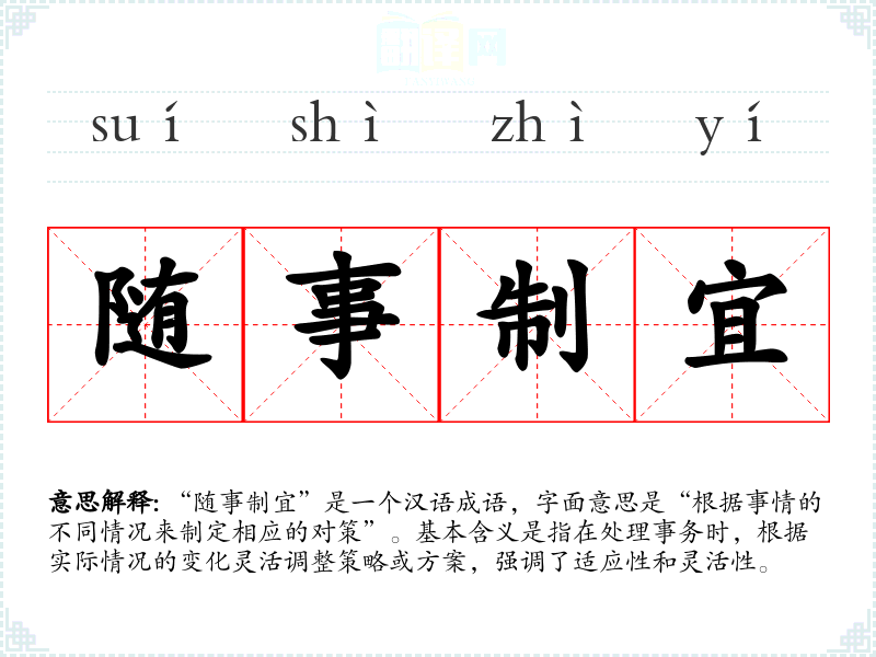 “随事制宜”是一个汉语成语,字面意思是“根据事情的不同情况来制定相应的对策”。基本含义是指在处理事务时,根据实际情况的变化灵活调整策略或方案,强调了适应性和灵活性。
