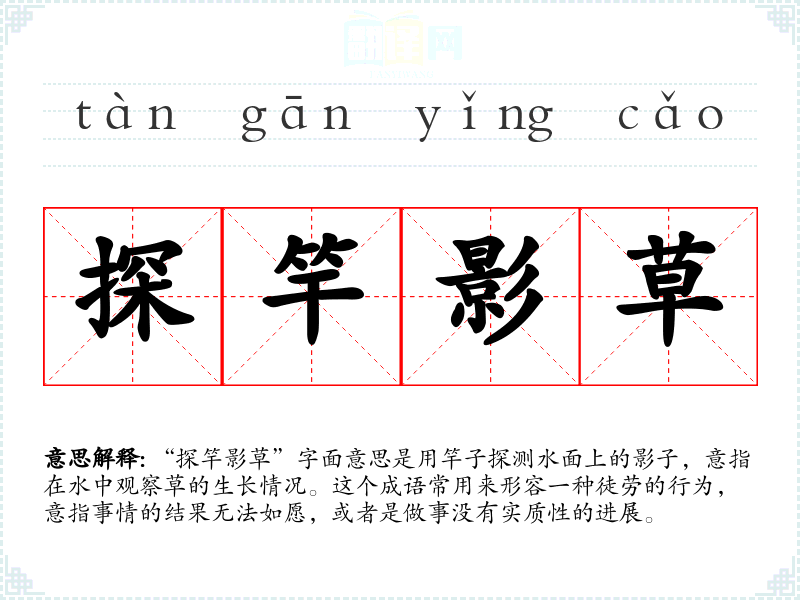 “探竿影草”字面意思是用竿子探测水面上的影子,意指在水中观察草的生长情况。这个成语常用来形容一种徒劳的行为,意指事情的结果无法如愿,或者是做事没有实质性的进展。