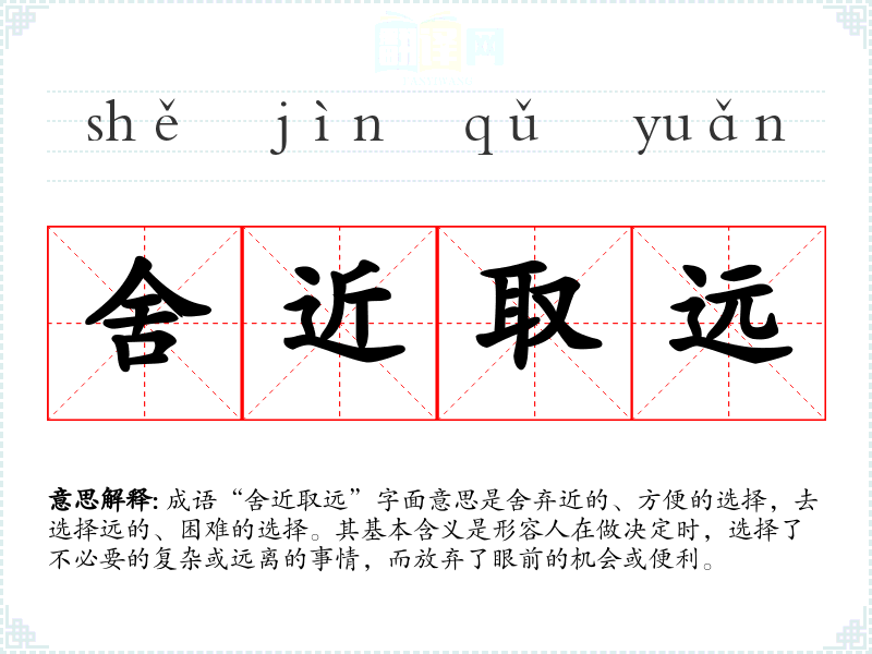 成语“舍近取远”字面意思是舍弃近的、方便的选择,去选择远的、困难的选择。其基本含义是形容人在做决定时,选择了不必要的复杂或远离的事情,而放弃了眼前的机会或便利。