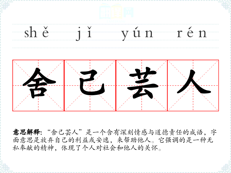 “舍己芸人”是一个含有深刻情感与道德责任的成语,字面意思是放弃自己的利益或安逸,来帮助他人。它强调的是一种无私奉献的精神,体现了个人对社会和他人的关怀。
