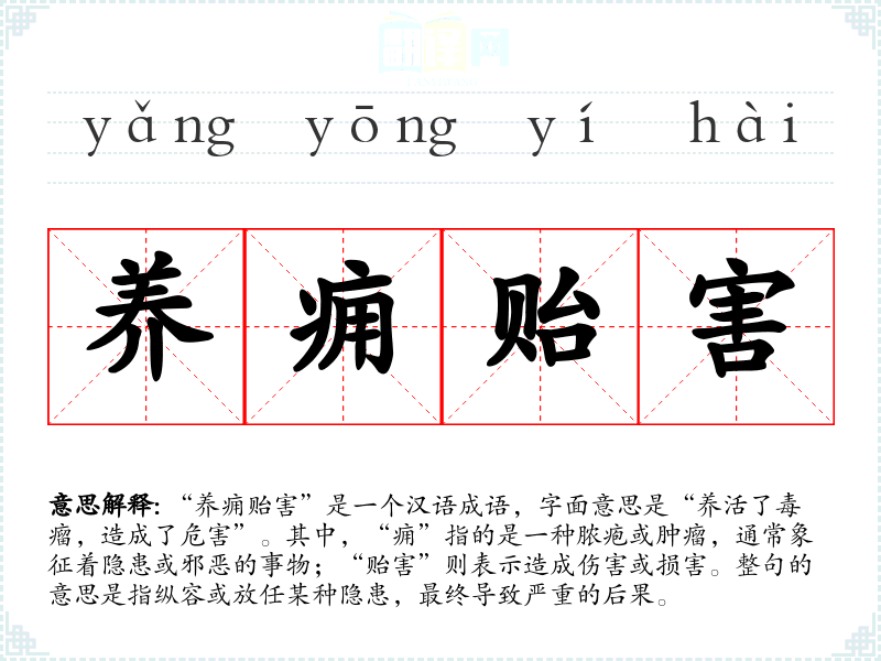 “养痈贻害”是一个汉语成语,字面意思是“养活了毒瘤,造成了危害”。其中,“痈”指的是一种脓疱或肿瘤,通常象征着隐患或邪恶的事物;“贻害”则表示造成伤害或损害。整句的意思是指纵容或放任某种隐患,最终导致严重的后果。