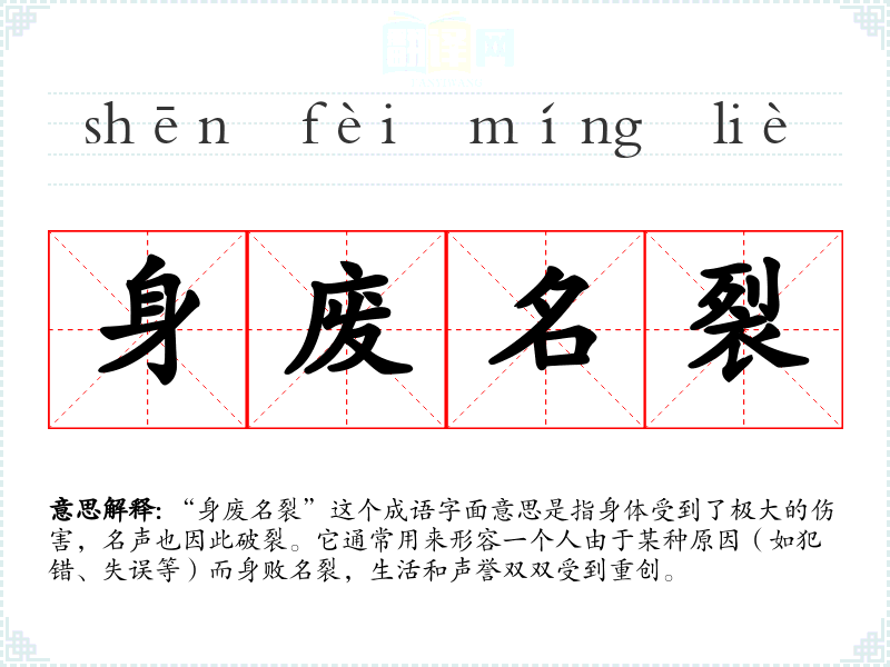 “身废名裂”这个成语字面意思是指身体受到了极大的伤害,名声也因此破裂。它通常用来形容一个人由于某种原因(如犯错、失误等)而身败名裂,生活和声誉双双受到重创。