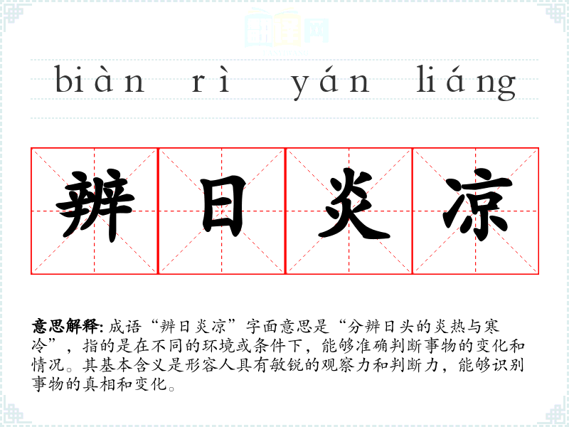成语“辨日炎凉”字面意思是“分辨日头的炎热与寒冷”,指的是在不同的环境或条件下,能够准确判断事物的变化和情况。其基本含义是形容人具有敏锐的观察力和判断力,能够识别事物的真相和变化。