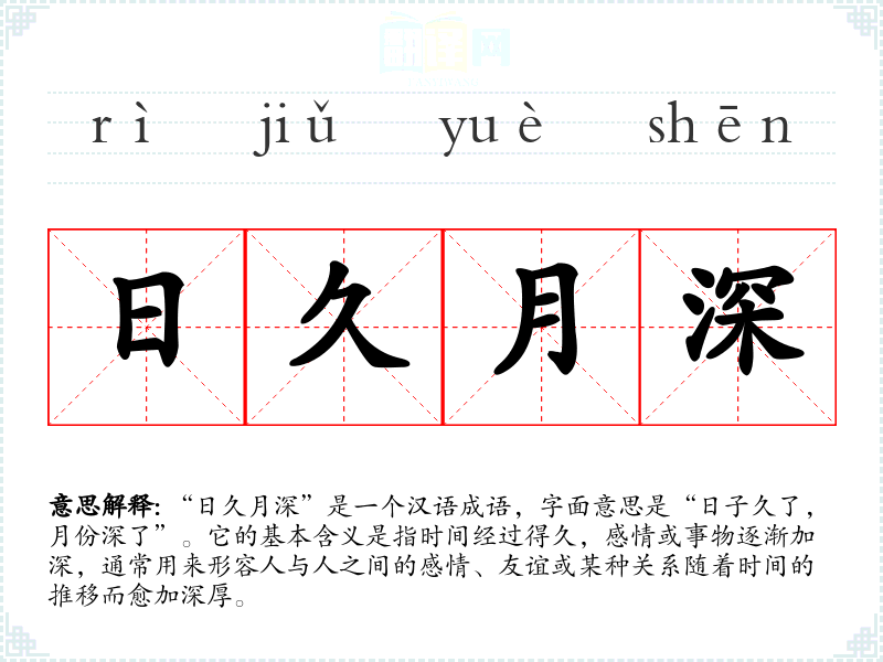 “日久月深”是一个汉语成语,字面意思是“日子久了,月份深了”。它的基本含义是指时间经过得久,感情或事物逐渐加深,通常用来形容人与人之间的感情、友谊或某种关系随着时间的推移而愈加深厚。