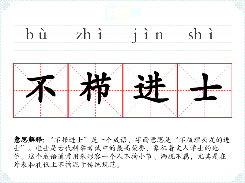 “不栉进士”是一个成语,字面意思是“不梳理头发的进士”。进士是古代科举考试中的最高荣誉,象征着文人学士的地位。这个成语通常用来形容一个人不拘小节、洒脱不羁,尤其是在外表和礼仪上不拘泥于传统规范。