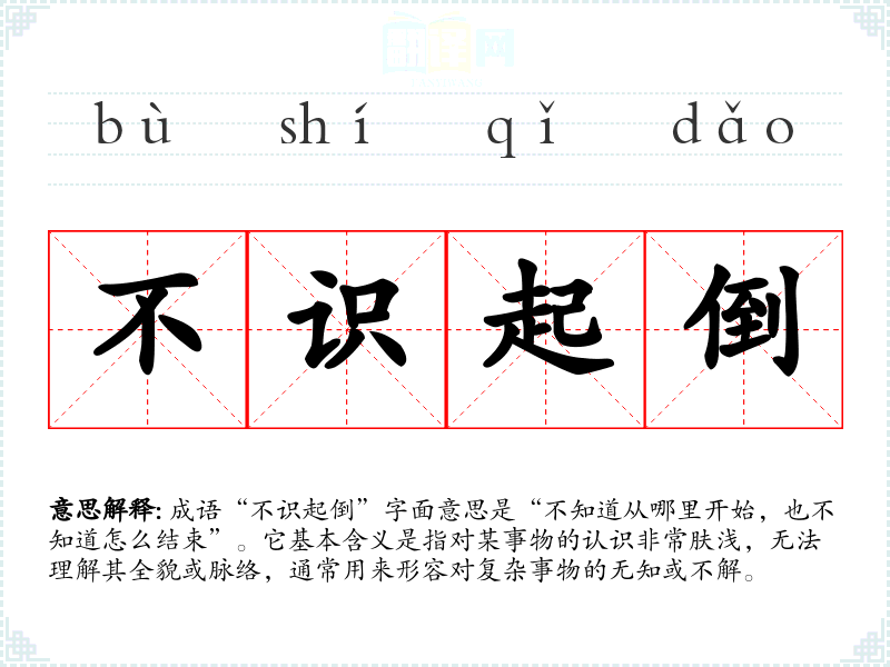 成语“不识起倒”字面意思是“不知道从哪里开始,也不知道怎么结束”。它基本含义是指对某事物的认识非常肤浅,无法理解其全貌或脉络,通常用来形容对复杂事物的无知或不解。