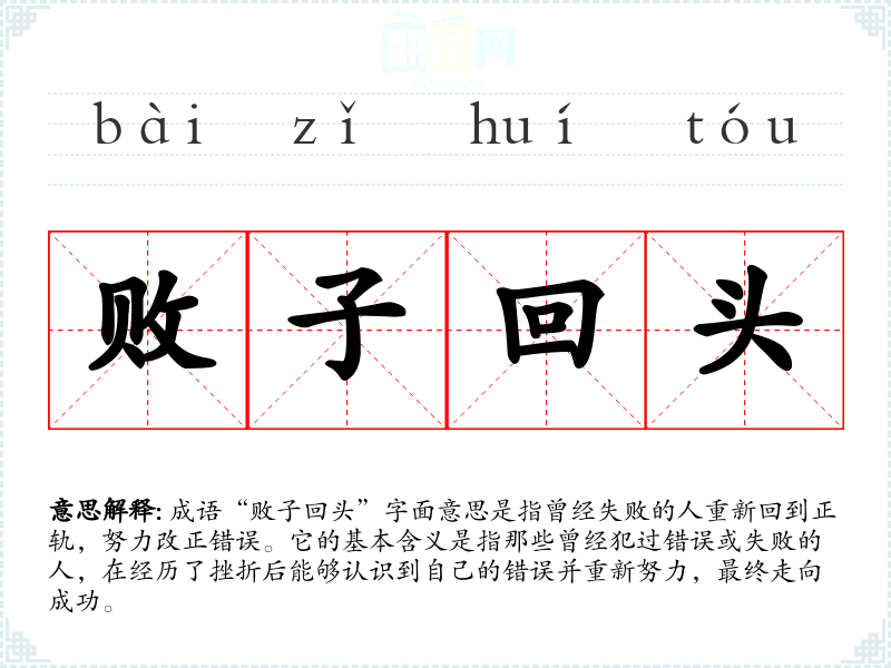 成语“败子回头”字面意思是指曾经失败的人重新回到正轨,努力改正错误。它的基本含义是指那些曾经犯过错误或失败的人,在经历了挫折后能够认识到自己的错误并重新努力,最终走向成功。