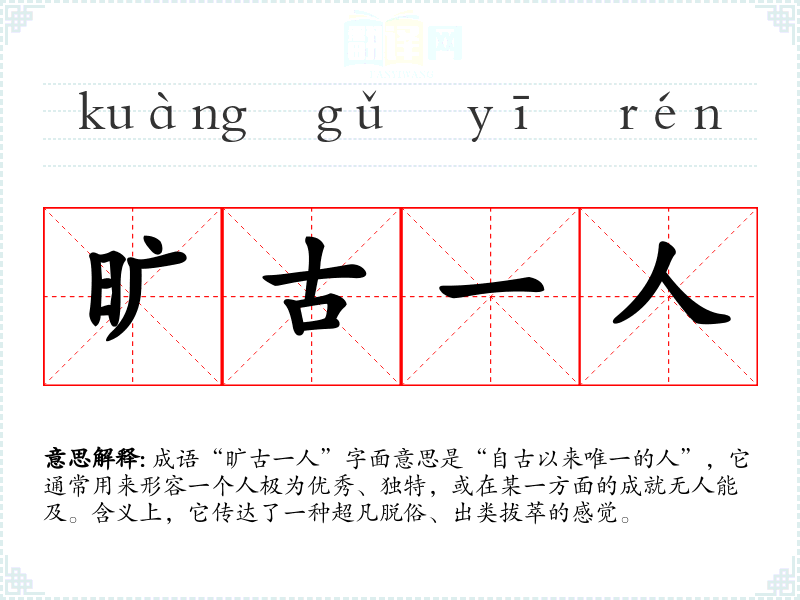 成语“旷古一人”字面意思是“自古以来唯一的人”,它通常用来形容一个人极为优秀、独特,或在某一方面的成就无人能及。含义上,它传达了一种超凡脱俗、出类拔萃的感觉。