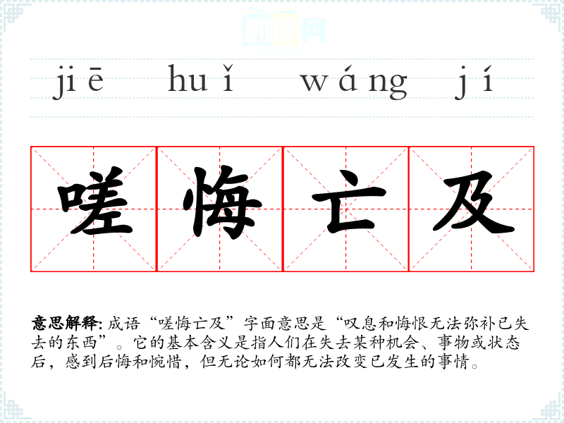 成语“嗟悔亡及”字面意思是“叹息和悔恨无法弥补已失去的东西”。它的基本含义是指人们在失去某种机会、事物或状态后,感到后悔和惋惜,但无论如何都无法改变已发生的事情。