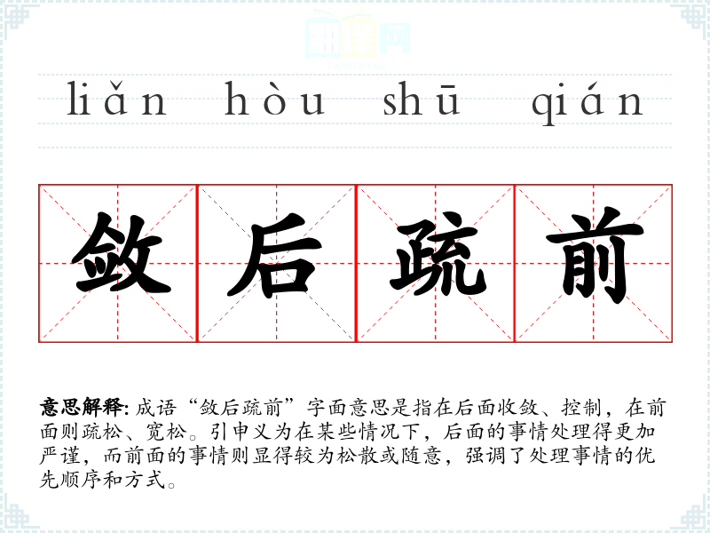 成语“敛后疏前”字面意思是指在后面收敛、控制,在前面则疏松、宽松。引申义为在某些情况下,后面的事情处理得更加严谨,而前面的事情则显得较为松散或随意,强调了处理事情的优先顺序和方式。