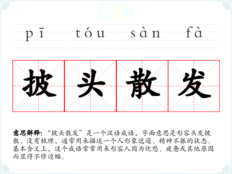 “披头散发”是一个汉语成语,字面意思是形容头发披散、没有梳理,通常用来描述一个人形象邋遢、精神不振的状态。基本含义上,这个成语常常用来形容人因为忧愁、疲惫或其他原因而显得不修边幅。