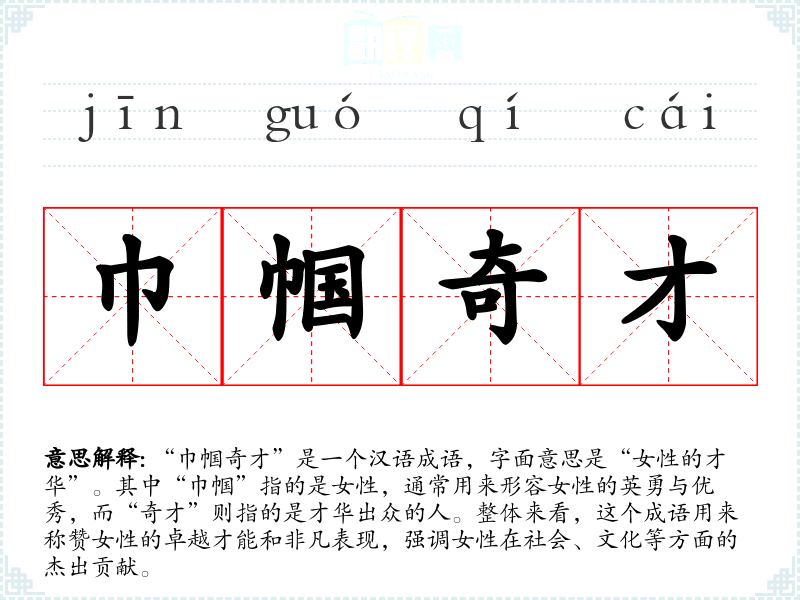 “巾帼奇才”是一个汉语成语,字面意思是“女性的才华”。其中“巾帼”指的是女性,通常用来形容女性的英勇与优秀,而“奇才”则指的是才华出众的人。整体来看,这个成语用来称赞女性的卓越才能和非凡表现,强调女性在社会、文化等方面的杰出贡献。