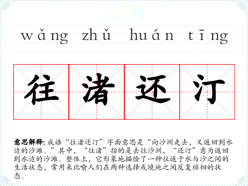 成语“往渚还汀”字面意思是“向沙洲走去,又返回到水边的沙滩。”其中,“往渚”指的是去往沙洲,“还汀”意为返回到水边的沙滩。整体上,它形象地描绘了一种往返于水与沙之间的生活状态,常用来比喻人们在两种选择或境地之间反复徘徊的状态。