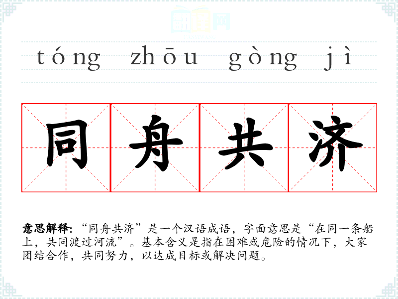 “同舟共济”是一个汉语成语,字面意思是“在同一条船上,共同渡过河流”。基本含义是指在困难或危险的情况下,大家团结合作,共同努力,以达成目标或解决问题。