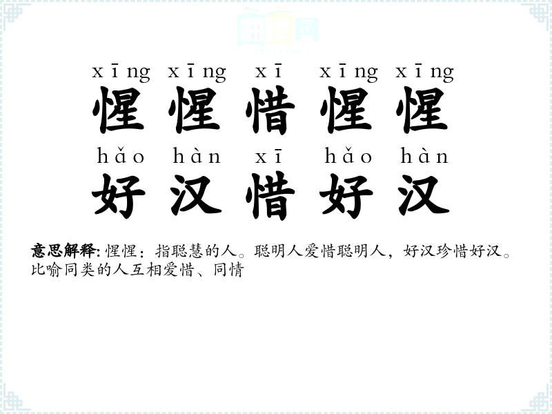 惺惺:指聪慧的人。聪明人爱惜聪明人,好汉珍惜好汉。比喻同类的人互相爱惜、同情 |