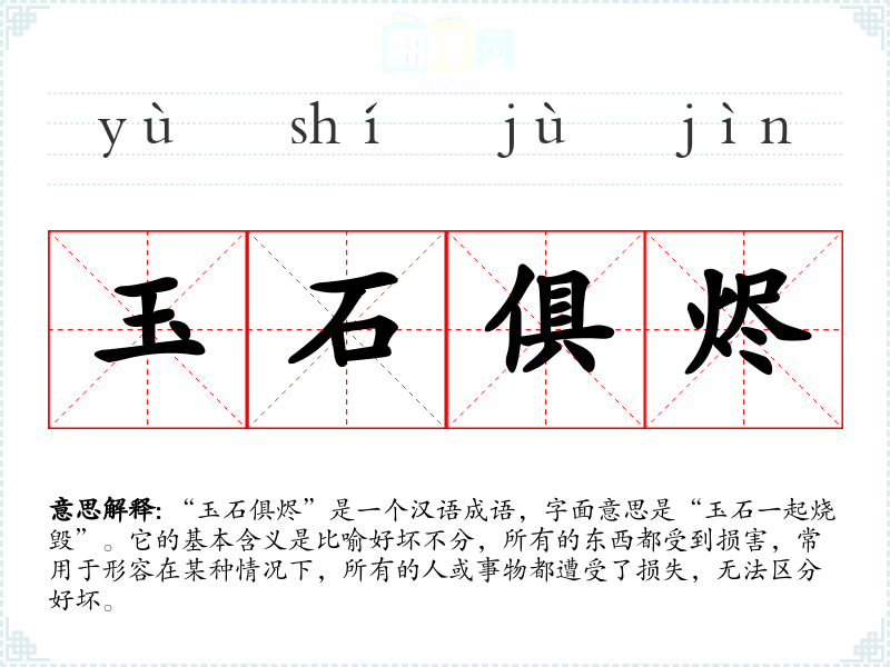 | 玉石俱烬 | 俱:全,都;烬:灰烬。美玉和石头一样烧坏。比喻好坏不分,同归于尽。 |