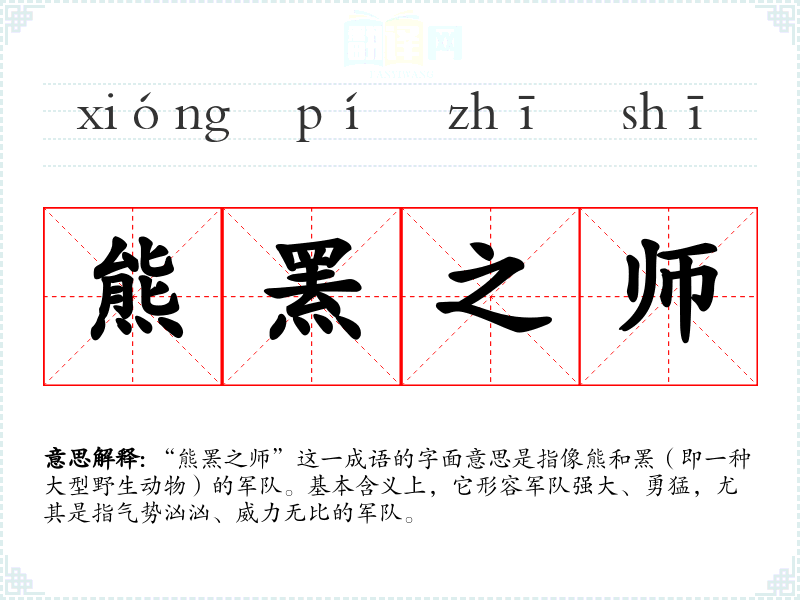 “熊罴之师”这一成语的字面意思是指像熊和罴(即一种大型野生动物)的军队。基本含义上,它形容军队强大、勇猛,尤其是指气势汹汹、威力无比的军队。