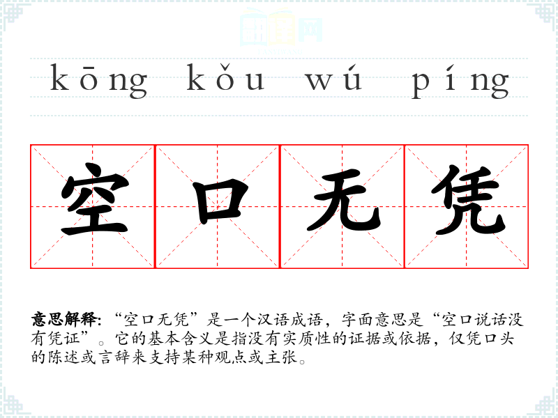 该成语的来源并不明确,但它的构成可以追溯到古代汉语中的“空口”和“无凭”两个部分。“空口”指的是没有事实依据的说法,而“无凭”则意指没有证据。成语强调了在言辞和主张中缺乏实证支持的情况,反映了古人对于言辞与事实之间关系的重视。