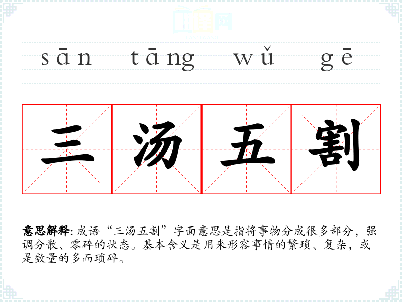 成语“三汤五割”字面意思是指将事物分成很多部分,强调分散、零碎的状态。基本含义是用来形容事情的繁琐、复杂,或是数量的多而琐碎。