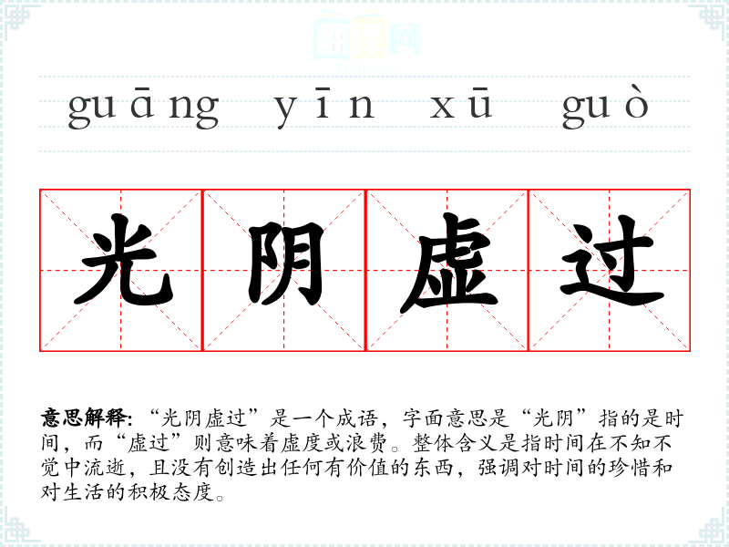 “光阴虚过”是一个成语,字面意思是“光阴”指的是时间,而“虚过”则意味着虚度或浪费。整体含义是指时间在不知不觉中流逝,且没有创造出任何有价值的东西,强调对时间的珍惜和对生活的积极态度。