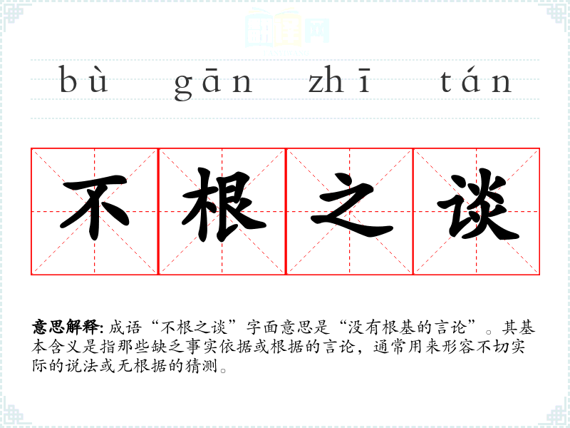 成语“不根之谈”字面意思是“没有根基的言论”。其基本含义是指那些缺乏事实依据或根据的言论,通常用来形容不切实际的说法或无根据的猜测。