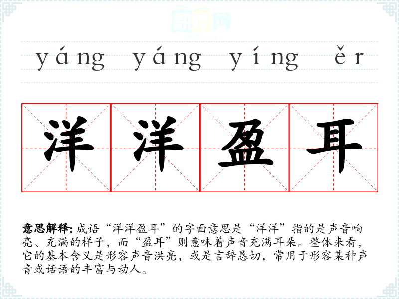 成语“洋洋盈耳”的字面意思是“洋洋”指的是声音响亮、充满的样子,而“盈耳”则意味着声音充满耳朵。整体来看,它的基本含义是形容声音洪亮,或是言辞恳切,常用于形容某种声音或话语的丰富与动人。