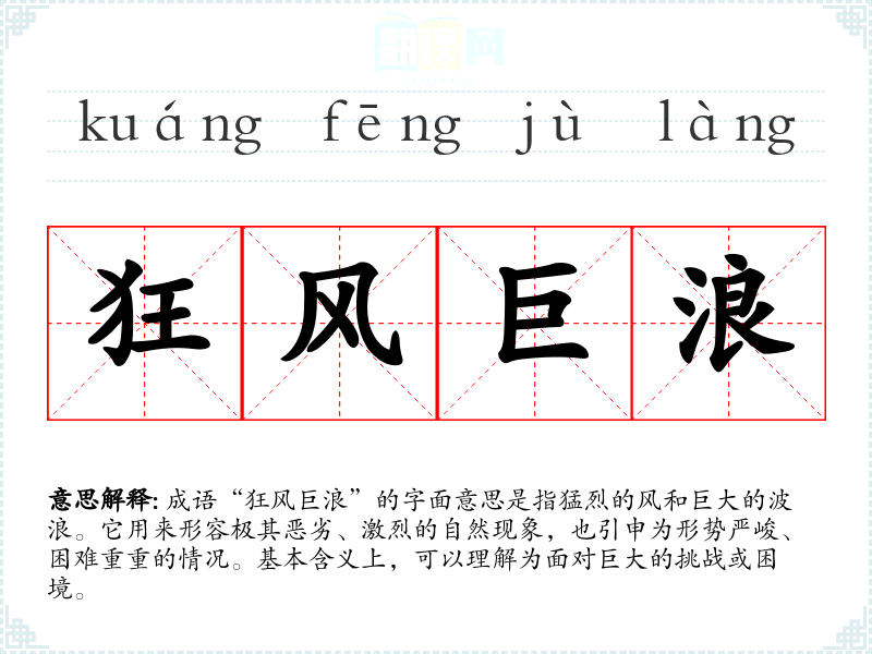 成语“狂风巨浪”的字面意思是指猛烈的风和巨大的波浪。它用来形容极其恶劣、激烈的自然现象,也引申为形势严峻、困难重重的情况。基本含义上,可以理解为面对巨大的挑战或困境。