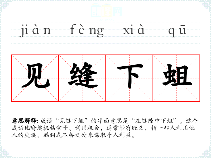 成语“见缝下蛆”的字面意思是“在缝隙中下蛆”。这个成语比喻趁机钻空子、利用机会,通常带有贬义,指一些人利用他人的失误、漏洞或不备之处来谋取个人利益。
